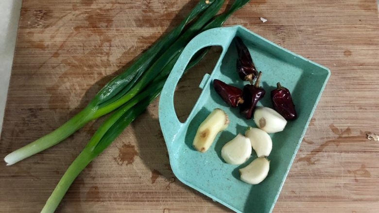 2. 小葱择好,姜去皮,蒜剥皮,与干辣椒一同洗净