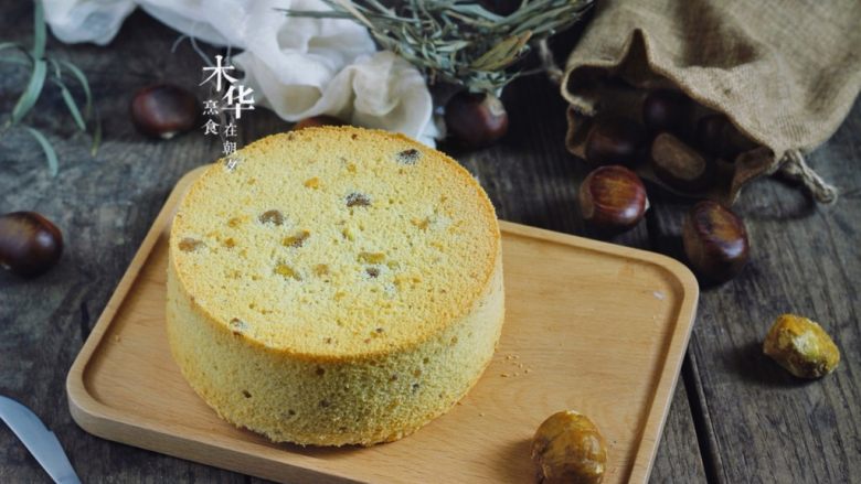 戚风蛋糕中加入熟板栗,很香哦,老人家很喜欢吃。方子为6寸,8寸翻倍。