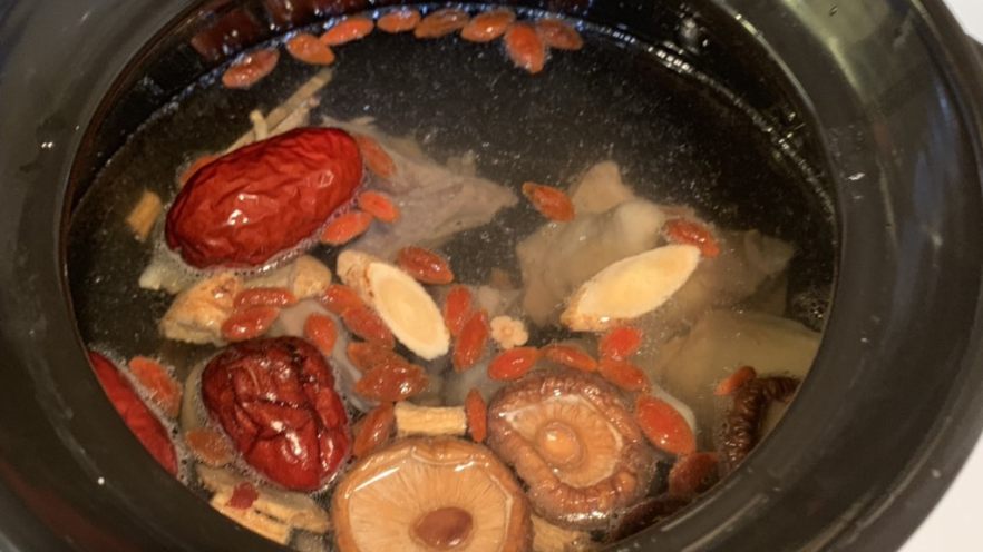 7. 将焯好的鸽子放入沙锅中,把姜片、香菇(香菇水一起倒入)枸杞、大枣和西洋参一并放入沙锅中。锅中添水没过鸽子5ml,盖上锅盖,小火煮3个小时即可