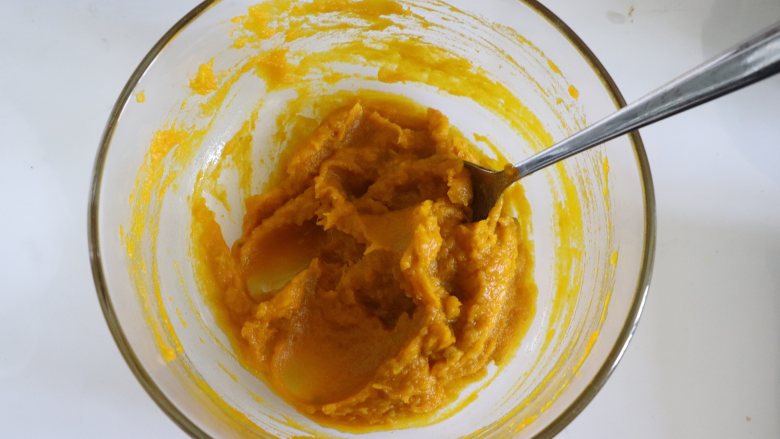 2. 用勺子压成细腻的南瓜泥。