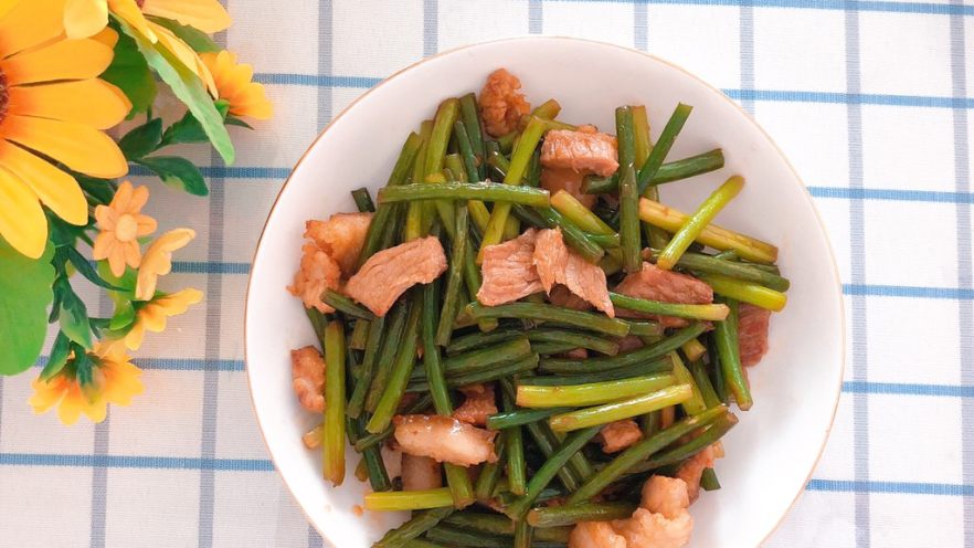 3. 剪蒜苔段时,尾巴的花扔掉。