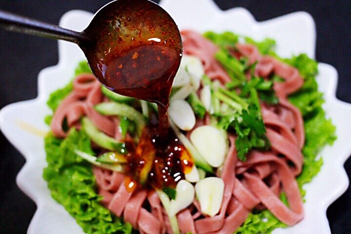 19. 面条上放入黄瓜丝,蒜片和香菜段