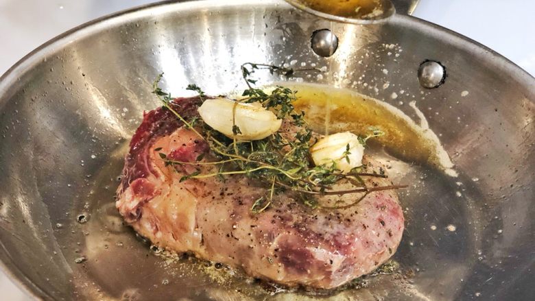 18. 将热油反覆浇淋在牛排上 牛排煎至所需要的熟度
