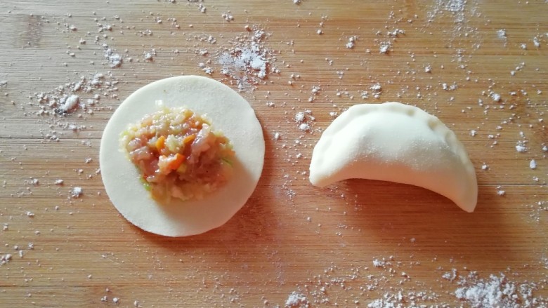 14. 取一个饺子皮,放上萝卜大肉馅,将边缘捏紧。
