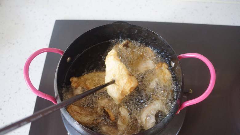7. 鱼肉炸到变色,可以用筷子扎透鱼肉就可以了。