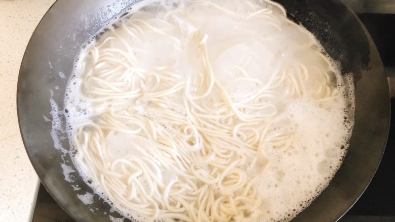 16. 将面放入锅中煮至浮起后再煮2分钟。