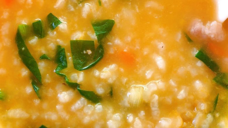 11. 倒入煮熟的粥内,小火,这个时候粥已经是黄色的了。