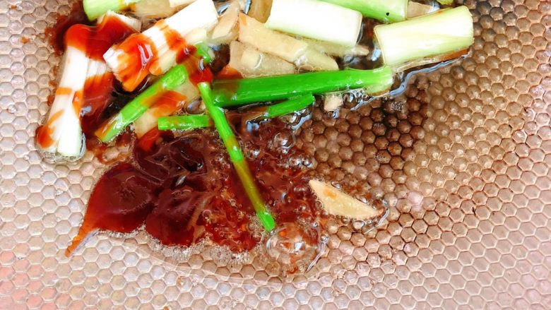 10. 另用炒锅倒入少许油,放入葱段姜丝,耗油,炒香。