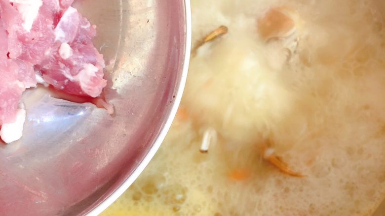 7. 米入锅,水适量多点,煮至半熟时倒入胡萝卜和香菇。