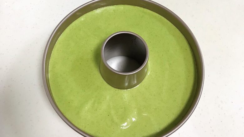 15. 翻拌好的蛋糕糊倒入8寸中空模具中,震出气泡。