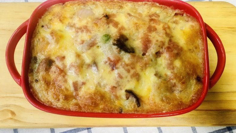 11. 烤箱预热后设置180度,中层烘烤15分钟左右,至奶酪变成金黄色即可出炉。烤制过程中奶酪芝士满屋飘香。
