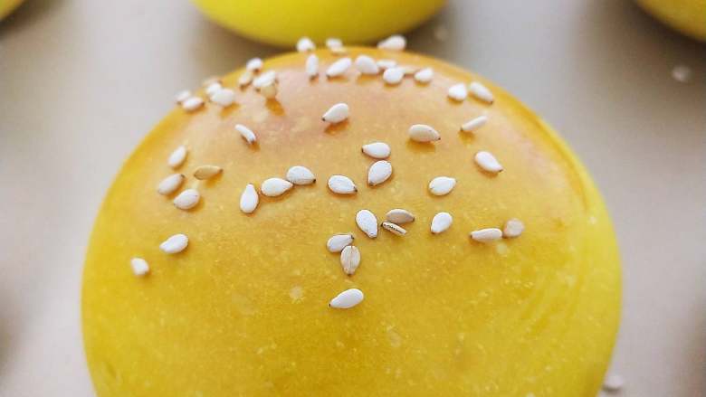 7. 看生胚明显变大,轻按迅速弹起,拿起很轻盈了,取出,预热烤箱180度5分钟以上,同时面包胚刷全蛋液,撒芝麻。
