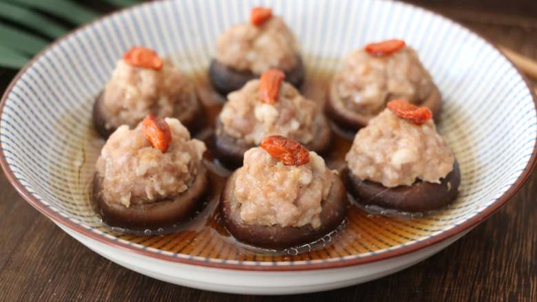 7. 将做好的香菇肉丸全部放入盘子中,上面点缀一粒枸杞。