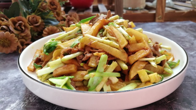 11. 牛肉炒熟,放入蒜苗,土豆条翻炒几下。