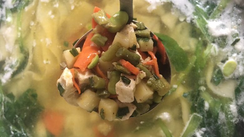 19. 油熟后,将切好的土豆、红萝卜、毛豆、豇豆、青椒倒入锅内开始炒