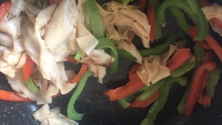 3. 3️⃣ 热锅倒入豆皮翻炒至干(没有放油,豆皮本身就是油炸过的,很吸油)