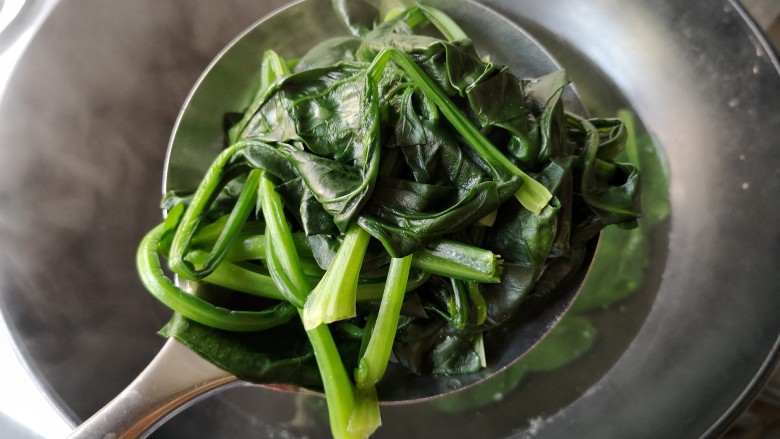 3. 将洗净的菠菜放在开水中烫1-2分钟,让草酸溶解在开水中,经过水焯以后菠菜中80%的草酸便可被除去。(菠菜含草酸多,吃起来有点发涩,草酸可与食物中的钙结合形成草酸钙,阻碍人体对钙的吸收,所以菠菜最好先焯水再入菜)
