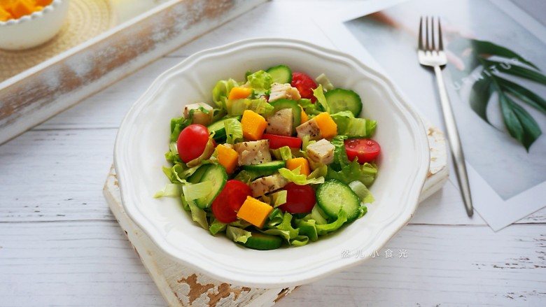 一道简单又不用担心吃了会胖胖的沙拉,蔬菜和水果可以根据你喜欢食材来搭配,鸡肉也可以换成其他肉类,如虾肉,鱼,牛肉,海鲜类的。