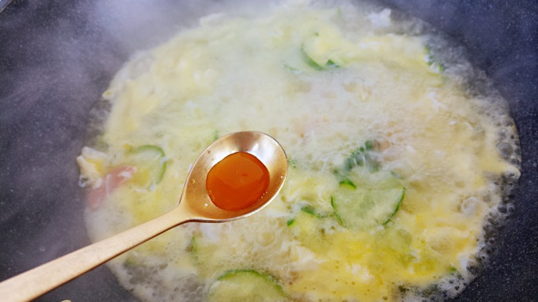 - 鸡蛋倒入锅内,快速搅拌,这样才能把鸡蛋液打散