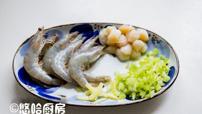 4. 煲粥的时候处理虾,白虾洗净剔掉虾线,芹菜洗净切碎丁待用。