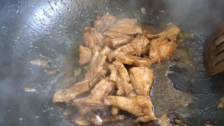 4. 加入五花肉翻炒至变色