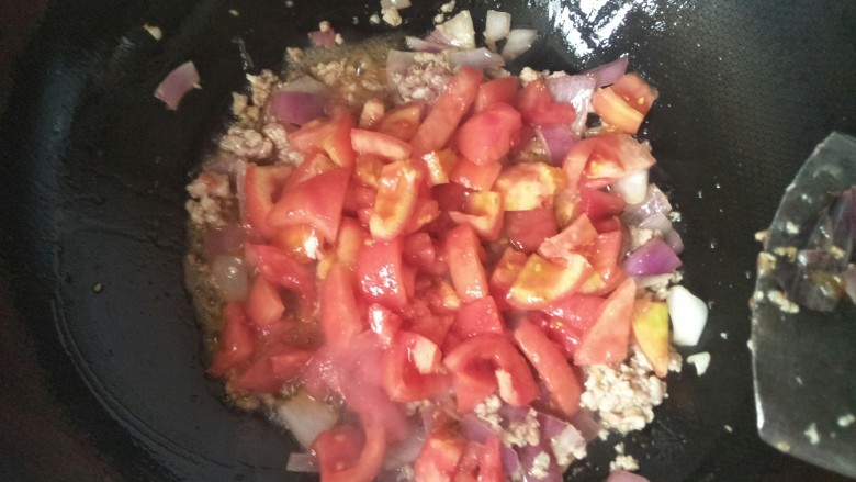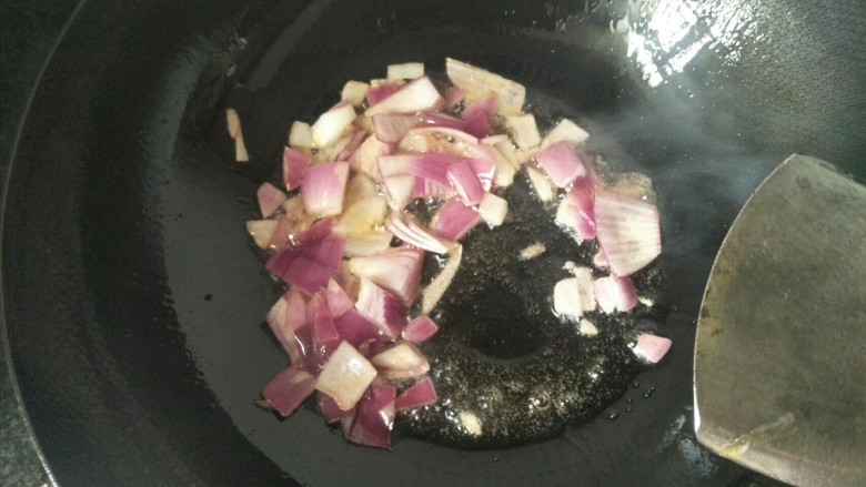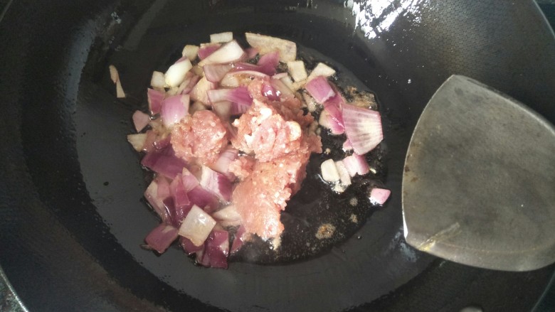 6. 锅内放油烧热放入切碎的洋葱抄出味来。