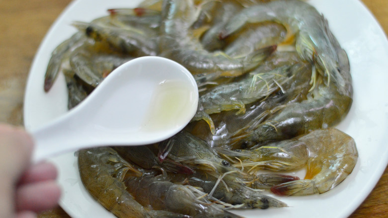 6. 锅里倒入稍微多一点油,放入虾,半煎炸的方式铺平煎制