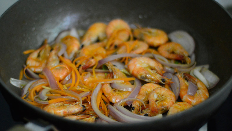 10. 接着放入胡萝卜和洋葱,翻炒至断生