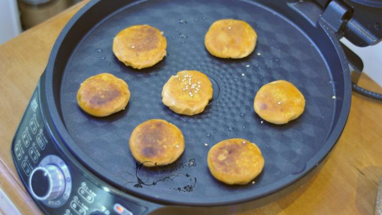 9. 煎至底部金黄,翻面撒上白芝麻,直至两面煎熟。