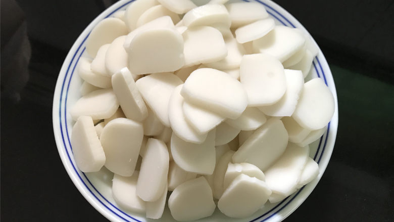 5. 年糕洗净后切成厚薄差不多的薄片。