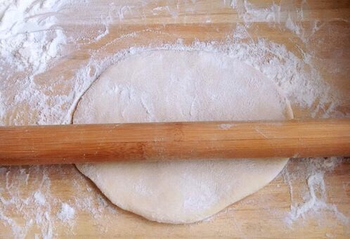 15. 在面团上撒上干面粉,用擀面杖将面卷起来,反复先向前然后再向后擀。 擀的时候稍稍向下压,给面一个压力,这样面就越擀越薄,