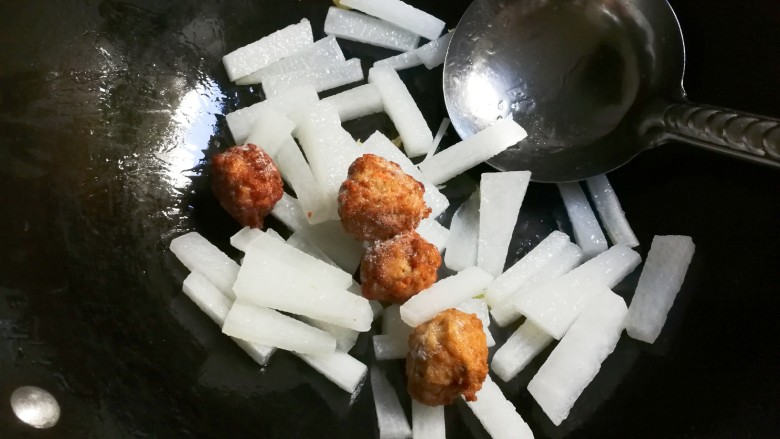 6. 放入白萝卜条翻炒片刻