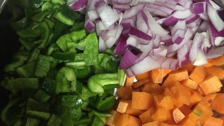 4. 热锅放入红萝卜,青椒,洋葱爆炒一下