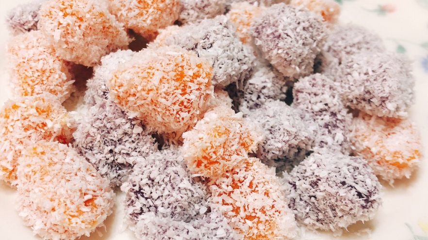 17. 放入薯圆滚一圈,让薯圆裹满椰蓉。