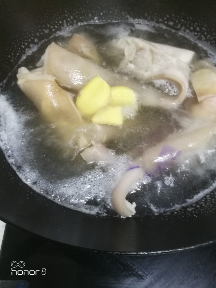4. 起锅注水,猪皮焯水,同时放入姜、料酒可祛膻味。
