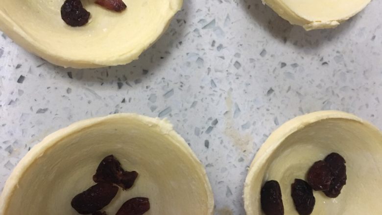 5. 5️⃣ 解冻好的蛋挞皮中可以事先放入适量蔓越莓啊葡萄干之类的,也可以不放啦。