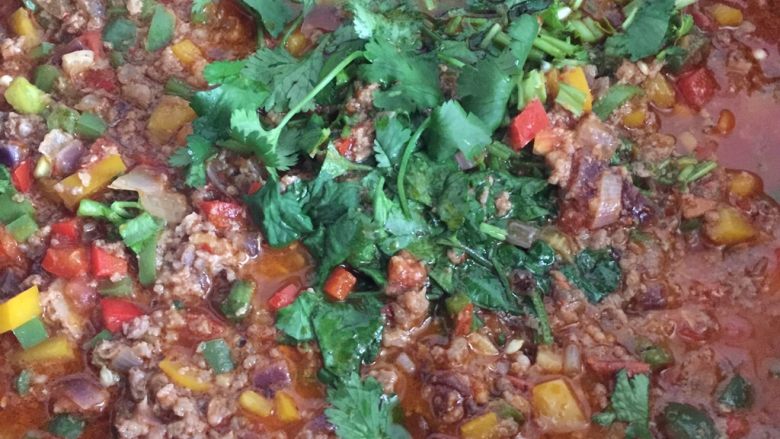 4. 最后放入香菜,另用一锅煮面,可加入绿色菜打底,面好后捞入盘中,再放一勺牛肉酱,拌匀就可以开吃啦!