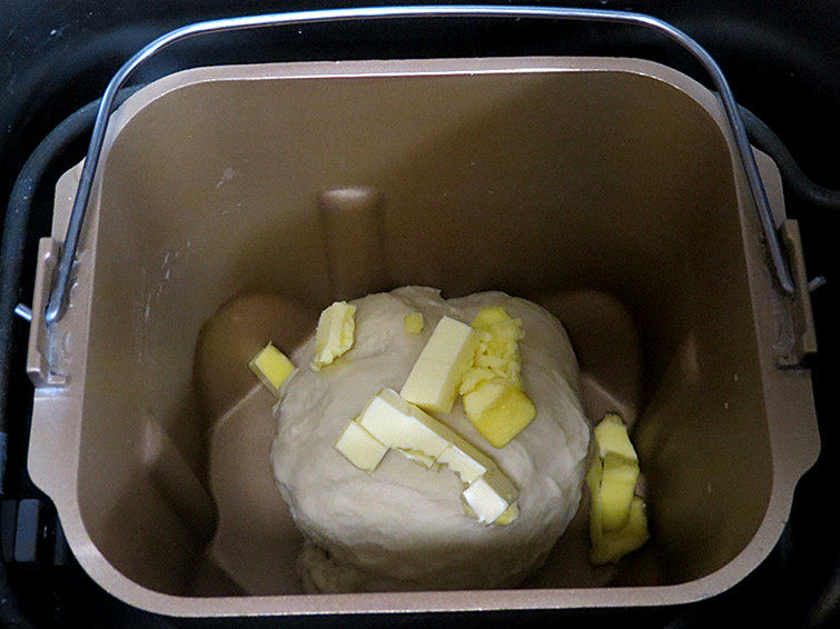 2. 开启揉面程序,揉面20分钟揉成一个光滑的面团,再加入室温软化的黄油,继续揉面程序20分钟