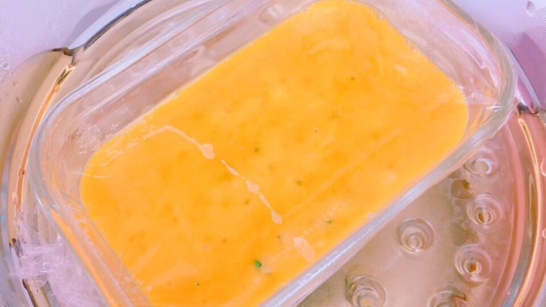6. 表面放好蛋黄;盖好保鲜膜蒸15分钟。