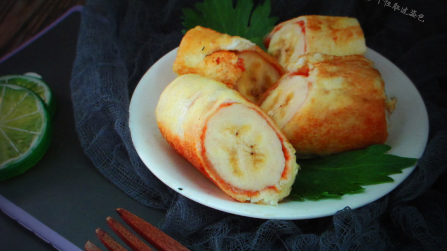 6. 将卷好的香蕉卷放入蛋液中,均匀的裹上蛋液
