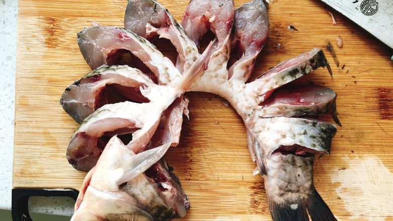 2. 将鱼身切成宽约3厘米厚度的段,鱼肚不切断。