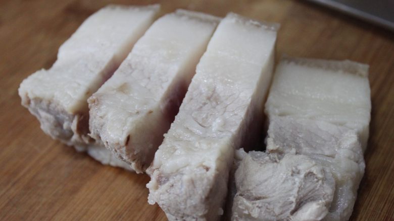 1. 五花肉切四方大块4厘米左右,放入水中煮5分钟取出备用