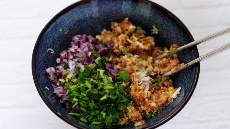 13. 把葱姜末搅拌均匀后,加入适量的盐调味。