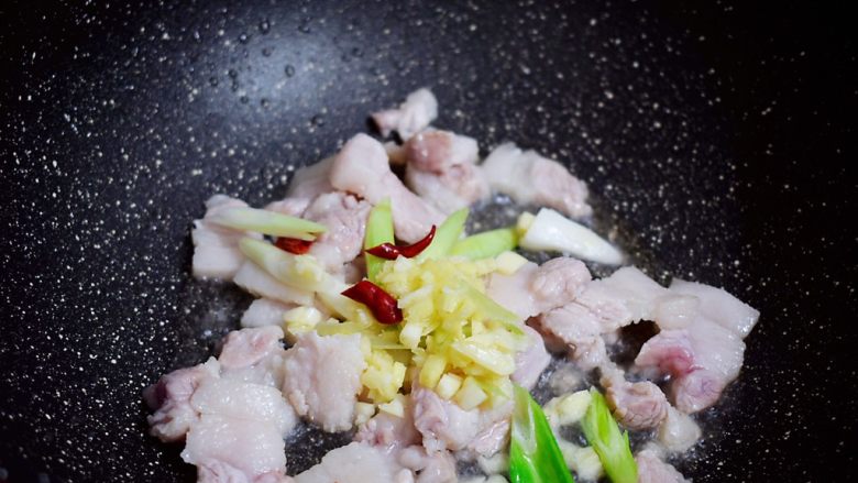 6. 再加入葱姜蒜和干红辣椒炒出香味