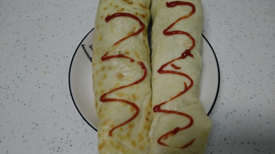 12. 卷起~盛入盘中~~均匀挤上番茄酱~~~小🐷说:妈妈,特别好吃,姐姐来家了你也给她做吃吧!