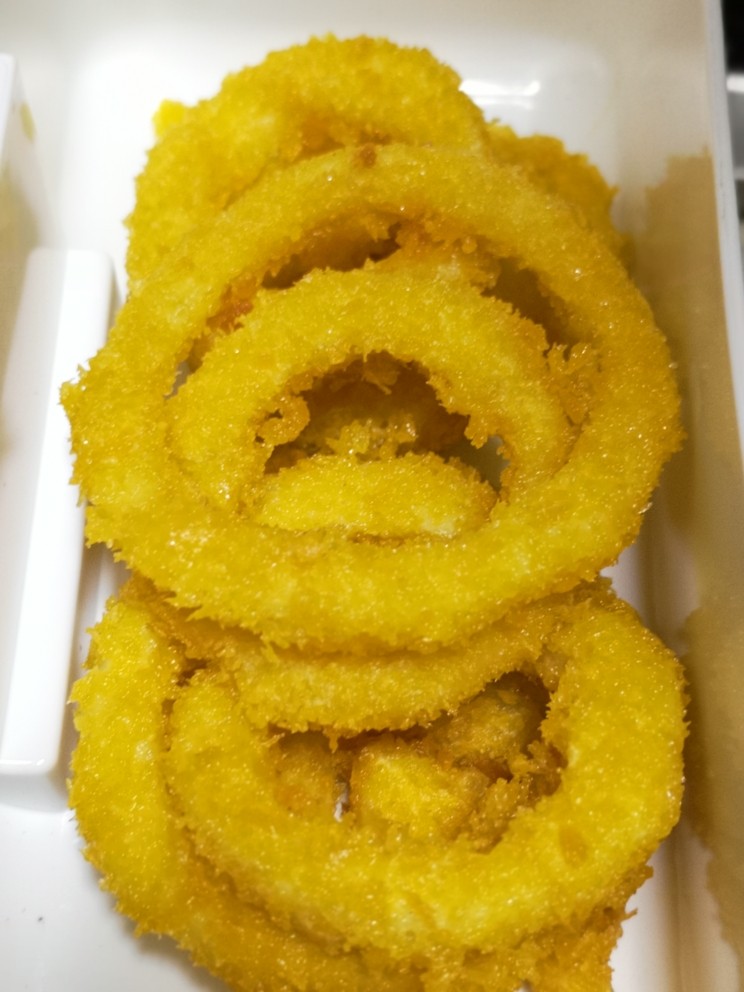 4. 把裹满蛋液的苹果圈再裹满面包糠 最后放进油锅里 一分钟就可以起锅