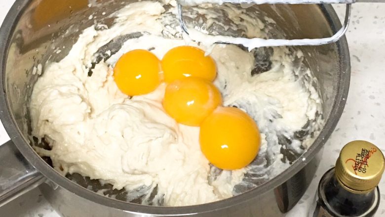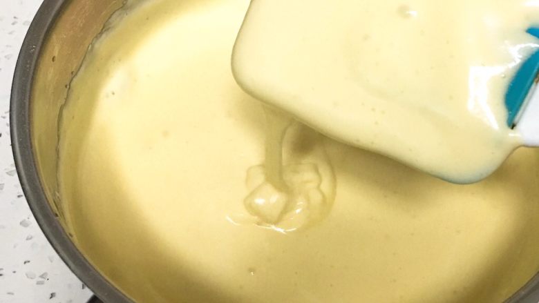 9. 先用打蛋器后用刮刀拌匀,蛋黄糊滴落的糊不会马上消失。