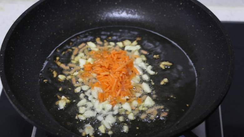 10. 锅内倒入适量食用油,爆香蒜末、胡萝卜碎。因为有小孩,所以没有放辣椒,喜欢吃辣的,这里可以加一些辣椒、剁椒都可以。