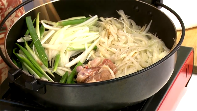4. 鐵鍋燒熱,加入適量食用油,放入雞肉煎至上色,依序放入牛蒡、洋蔥絲、蔥段、杏鮑菇片略炒