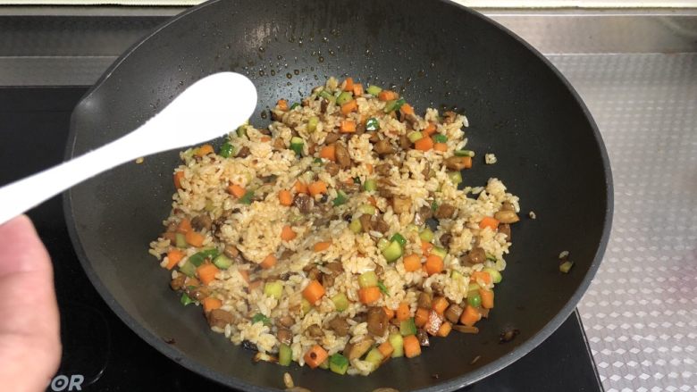 6. 倒入胡萝卜和黄瓜丁翻炒均匀